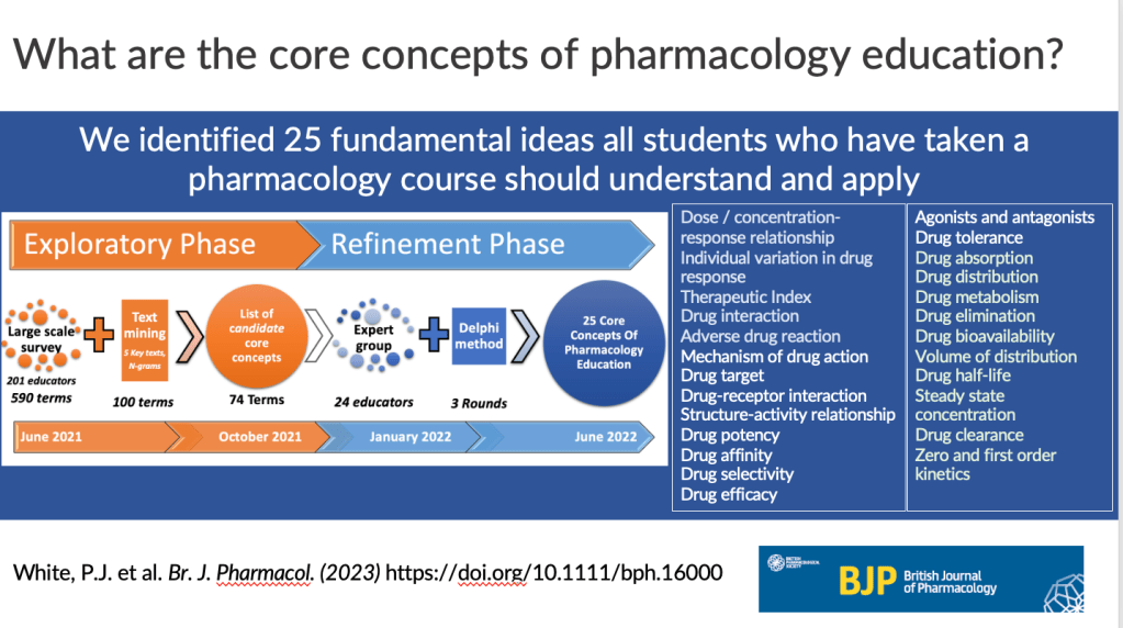 - A list of foundational core concepts of pharmacology education.